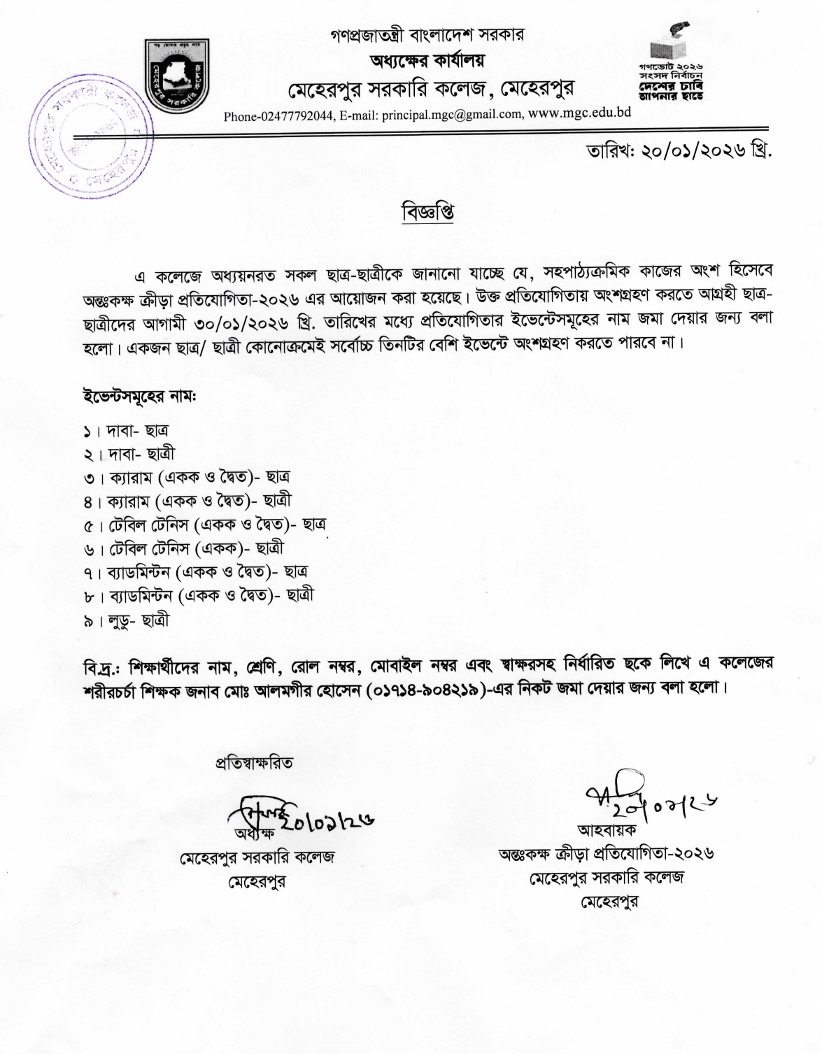 অন্তঃকক্ষ ক্রীড়া প্রতিযোগিতা-২০২৬ সংক্রান্ত নোটিশ