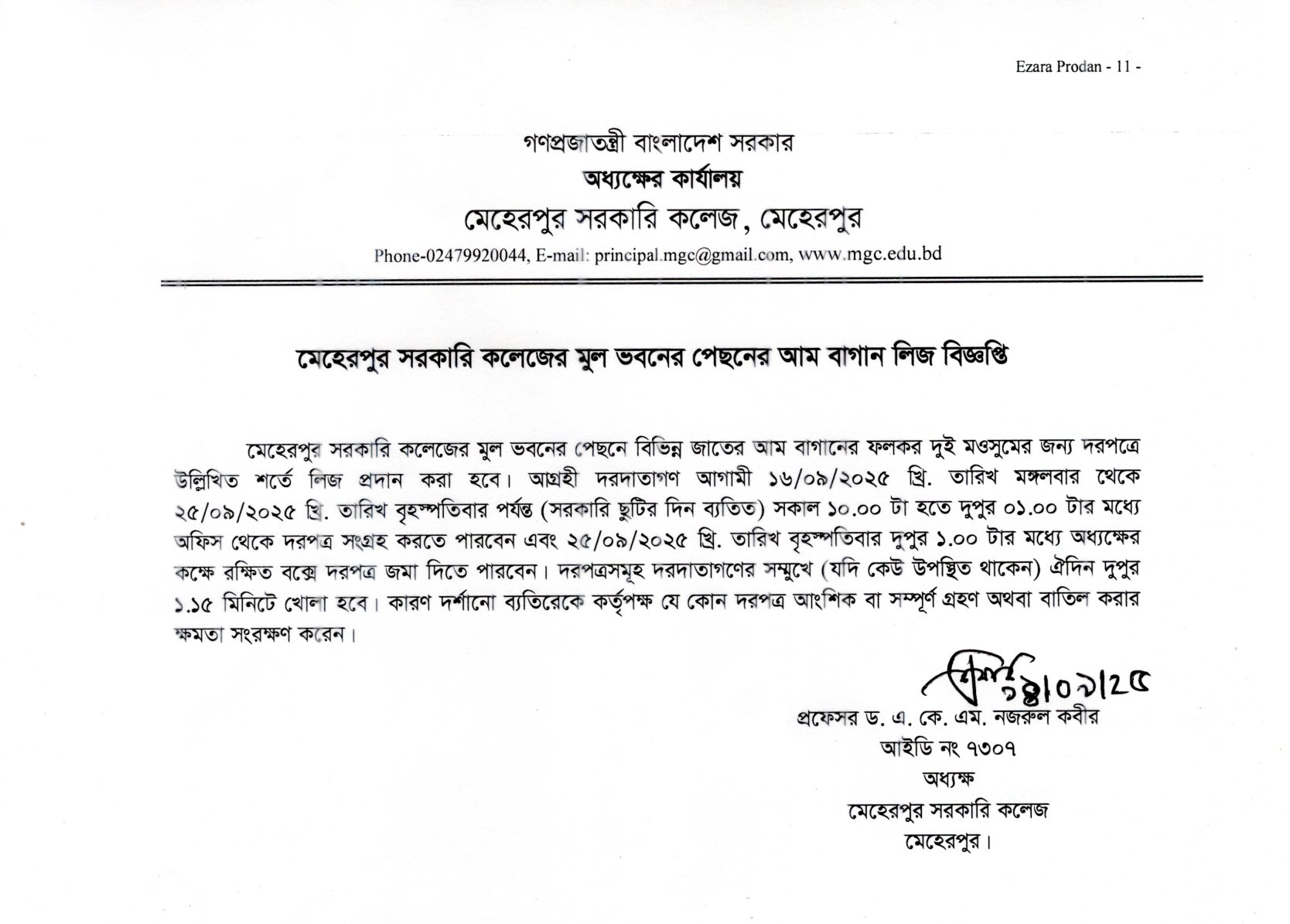 কলেজের মুল ভবনের পেছনের আম বাগান লিজ বিজ্ঞপ্তি