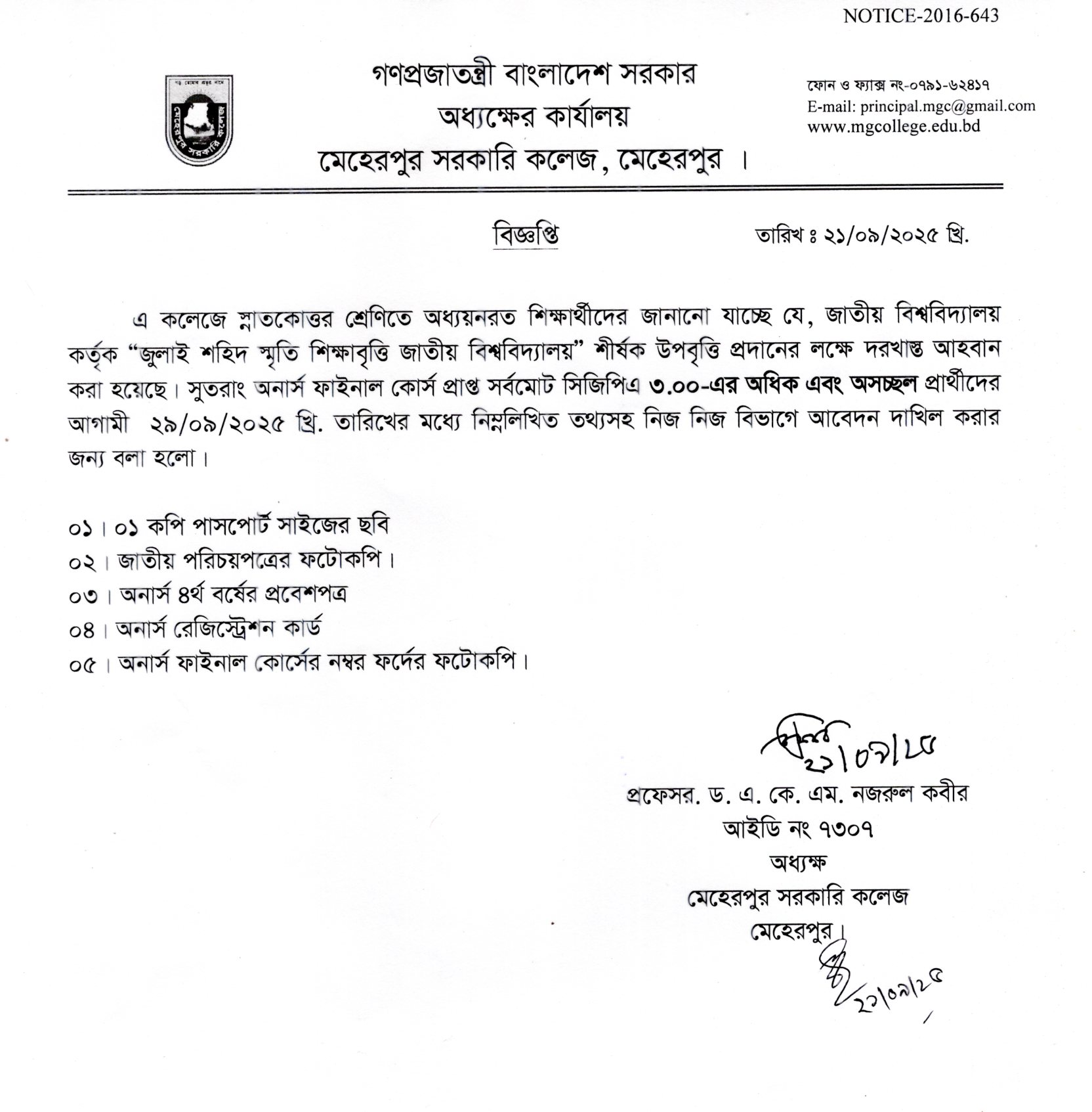 স্নাতকোত্তর শ্রেণির শিক্ষার্থীদের উপবৃত্তি সংক্রান্ত নোটিশ