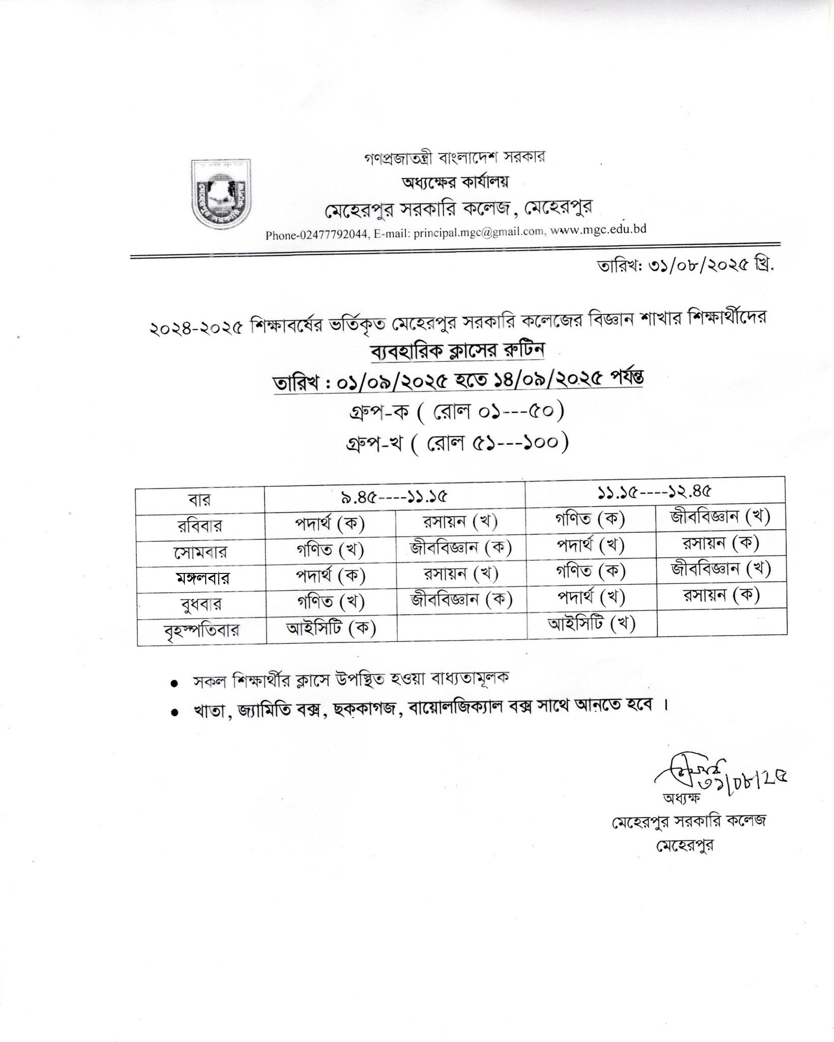 ২০২৪-২৫ শিক্ষাবর্ষের ভর্তিকৃত মেহেরপুর সরকারি কলেজের বিজ্ঞান শাখার শিক্ষার্থীদের ব্যবহারিক ক্লাসের রুটিন