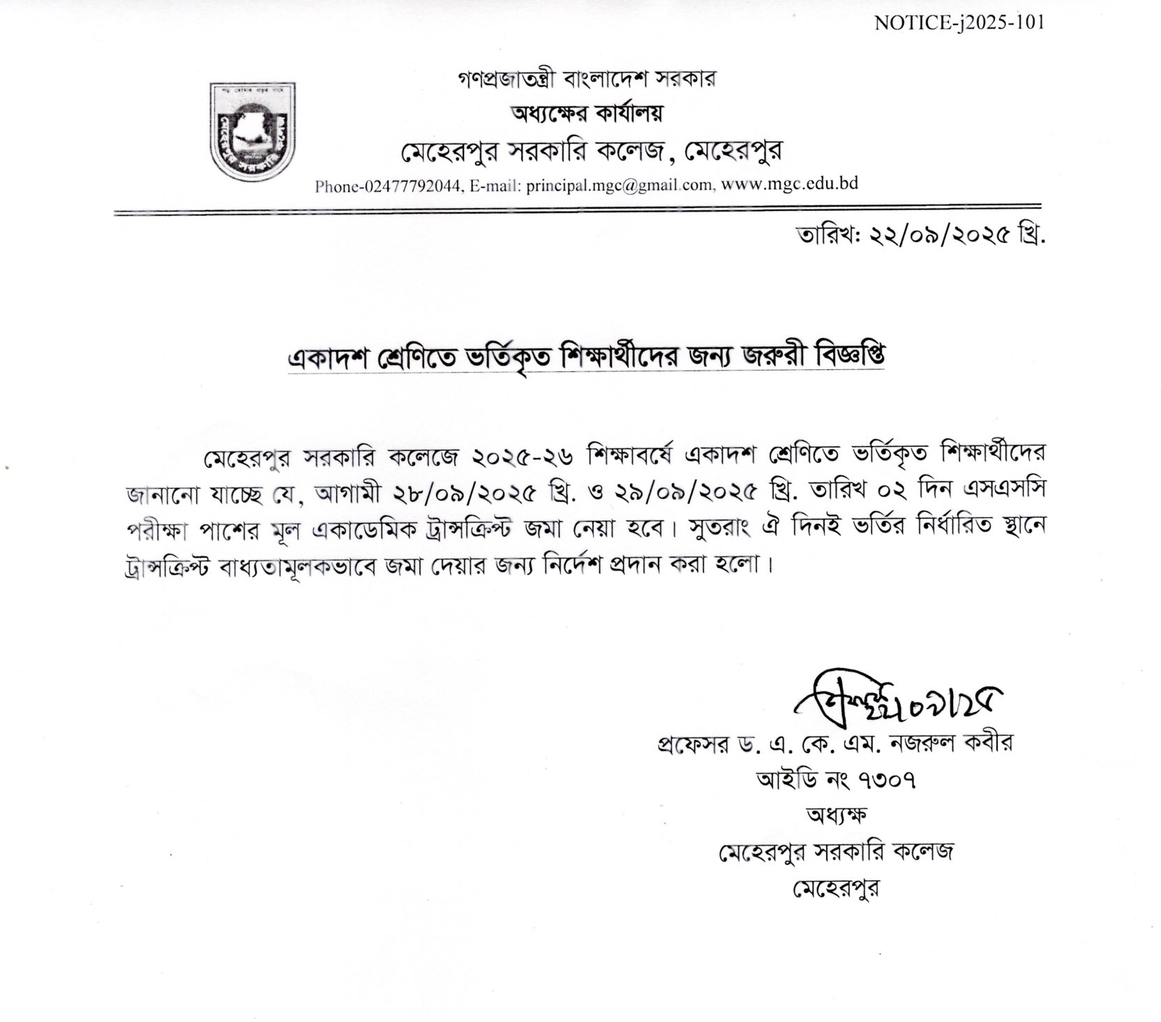 ২০২৫-২৬ শিক্ষাবর্ষের একাদশ শ্রেণির শিক্ষার্থীদের মূল একাডেমিক ট্রান্সক্রিপ্ট জমা সংক্রান্ত বিজ্ঞপ্তি