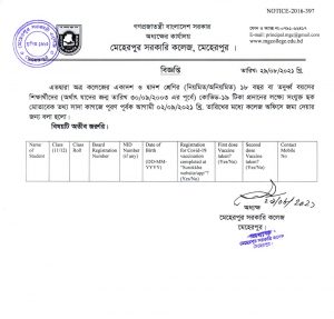 উচ্চ মাধ্যমিক একাদশ ও দ্বাদশ শ্রেণির শিক্ষার্থীদের কোভিড ১৯ টিকা প্রদানের লক্ষে তথ্য প্রদান সংক্রান্ত নোটিশ