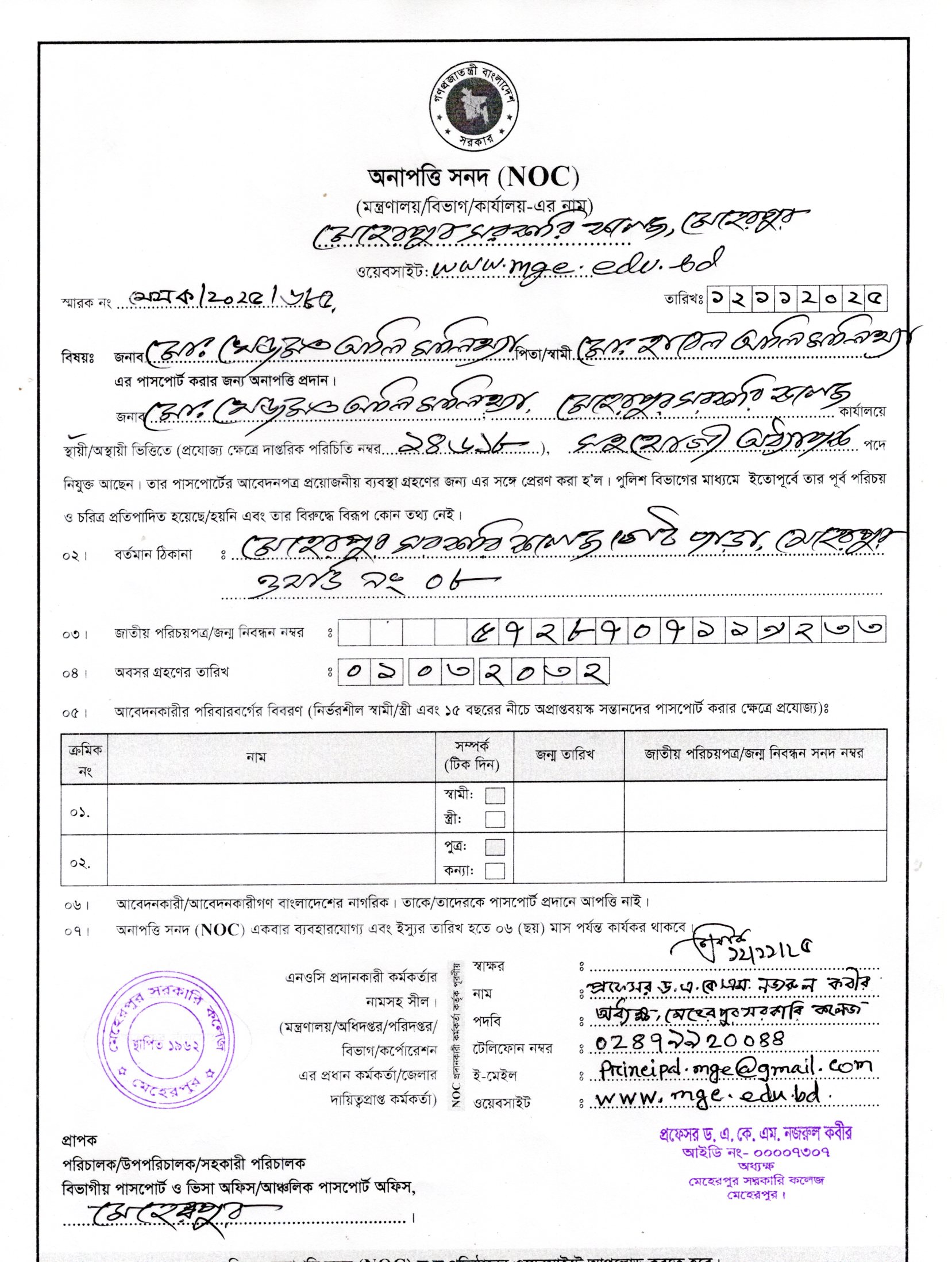 বাংলা বিভাগের সহযোগী অধ্যাপক জনাব মোঃ খেজমত আলি মালিথ্যা-এর অনাপত্তি সনদ