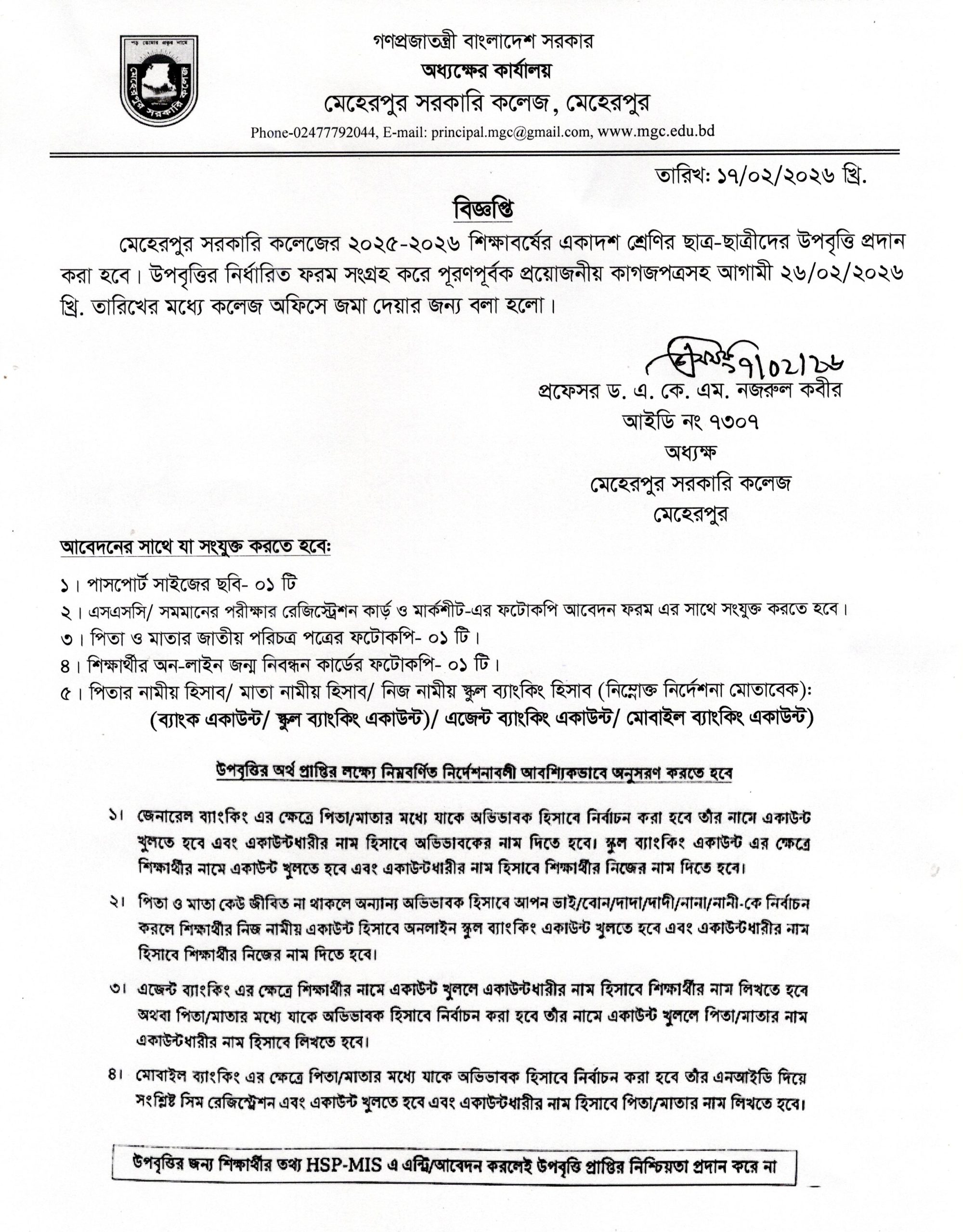 ২০২৫-২০২৬ শিক্ষাবর্ষের একাদশ শ্রেণিতে অধ্যয়নরত শিক্ষার্থীদের উপবৃত্তি সংক্রান্ত নোটিশ